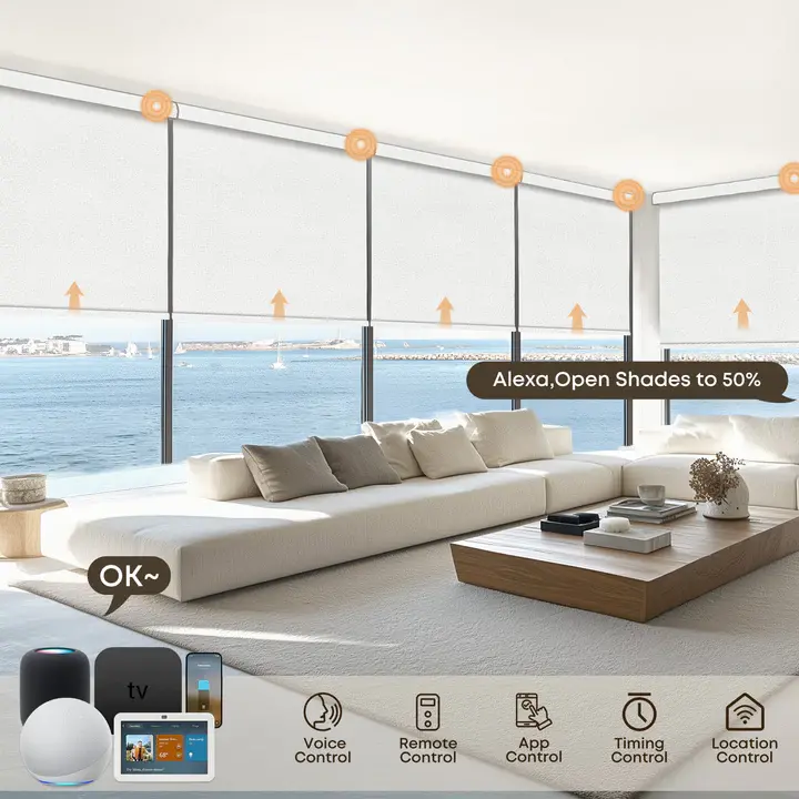 Transform your space with shades that respond to your voice, your schedule, and your mood. Whether you're welcoming the morning sun or winding down into twilight, our motorized roller shades offer seamless control, whisper-quiet movement, and a tailored ambiance. One touch, and your space breathes with light.